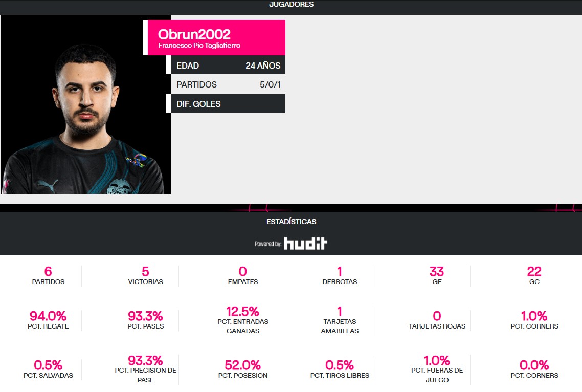 Cabe destacar que Francesco Pio Tagliaferro ‘Obrun’ acumula resultados importantes entre los que destacan: campeón Global Series Q3 FIFA 22, campeón Global Series Playoffs FIFA 22, ‘Top 3’ de FIFAe World Cup 2022, ‘Top 5’ eSerie A 2023, campeón de FIFAe Club Series FIFA 23 Europe South-East Playoffs, ‘Top 5’ eChampions League 2023, ‘Top 9’ FIFAe Club World Cup 2023, ‘Top 3’ FIFAe World Cup 2023, ‘Top 5’ FC PRO Open 2024 y ‘Top 5’ eSerie A 2024.
