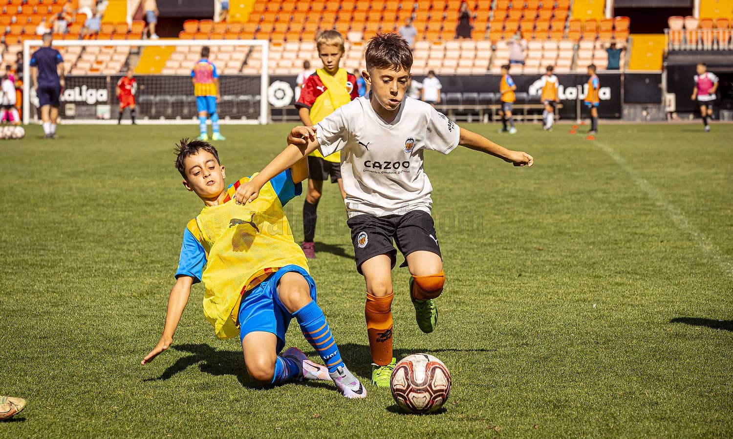 Cerca de un centenar de niños y niñas de entre 5 y 16 años pudieron calzarse las botas y la equipación oficial Puma y vivir una experiencia única en el Camp de Mestalla, allí donde todos sueñan algún día poder jugar como profesionales en el Valencia CF.