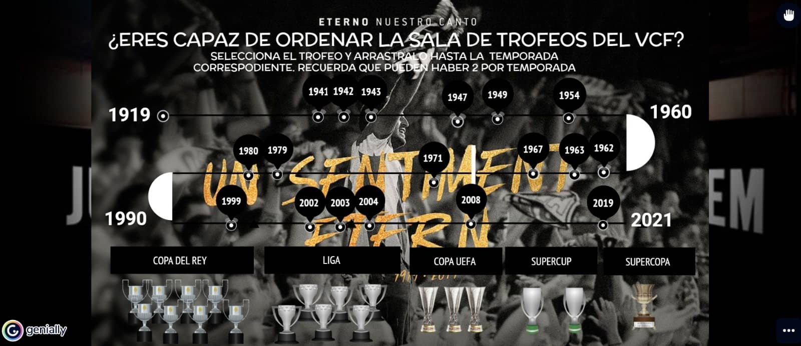 La actividad ha consistido en 3 timelines que permitían por un lado ubicar los grandes mitos y jugadores que marcaron época, por otro lado, los grandes momentos vividos en la historia del club y por último los títulos conseguidos en estos más de 100 años de historia. Historia General, Ídolos VCF y Trofeos han sido las tres temáticas que tenían de ordenar cronológicamente, al tiempo que les permitía recabar alguna información adicional sobre cada hito, jugador o momento reseñado.