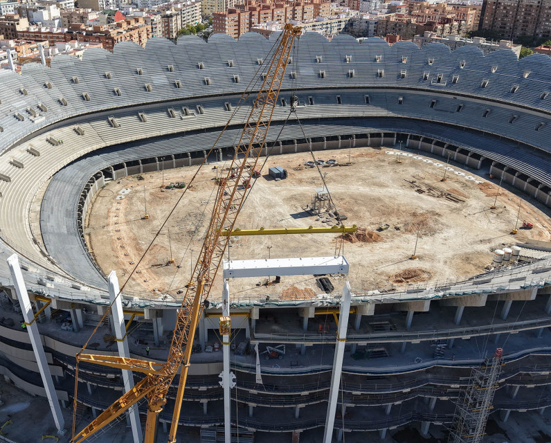 Ja s'ha instal·lat la primera peça de l'anell de compressió de la gran coberta del Nou Mestalla