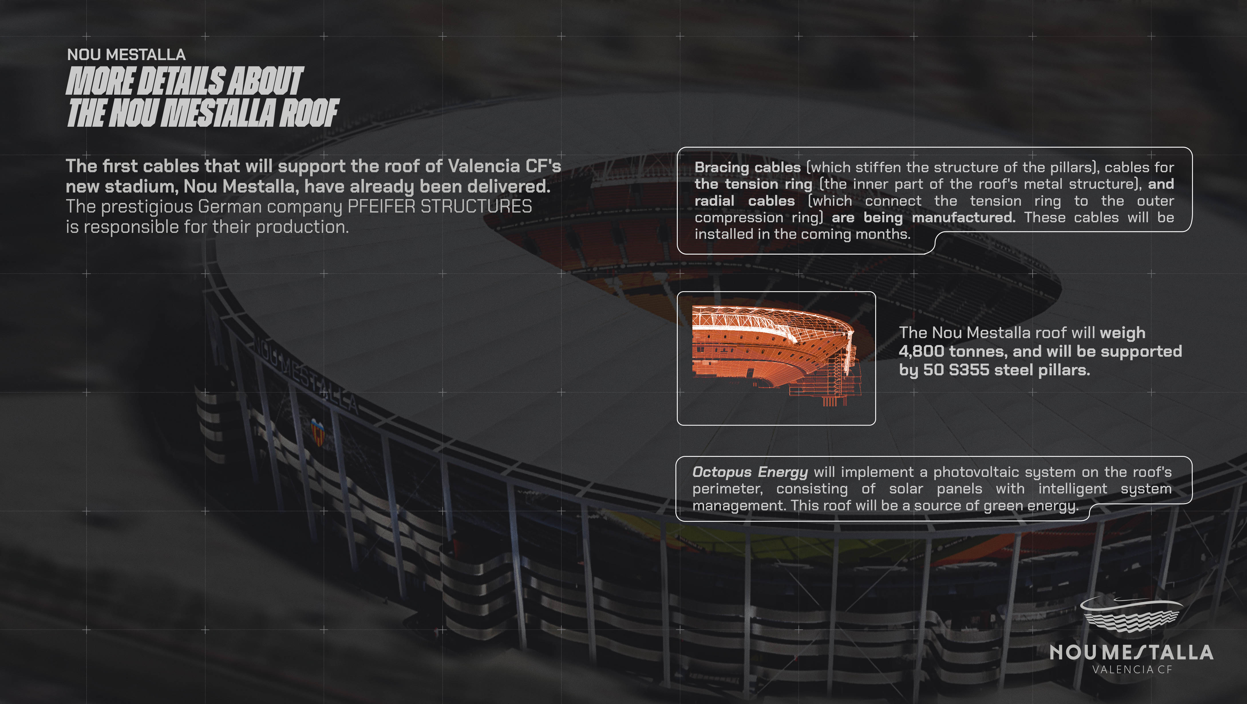 It is worth noting that the Nou Mestalla roof will weigh 4,800 tonnes and will be supported by 50 S355 steel pillars. In addition, on this roof Octopus Energy -Sustainable Founding Partner- will implement a photovoltaic installation, made up of solar panels with an intelligent system management, on its outer perimeter. A roof that will be a lung of green energy.